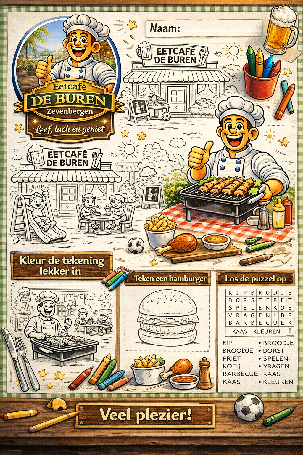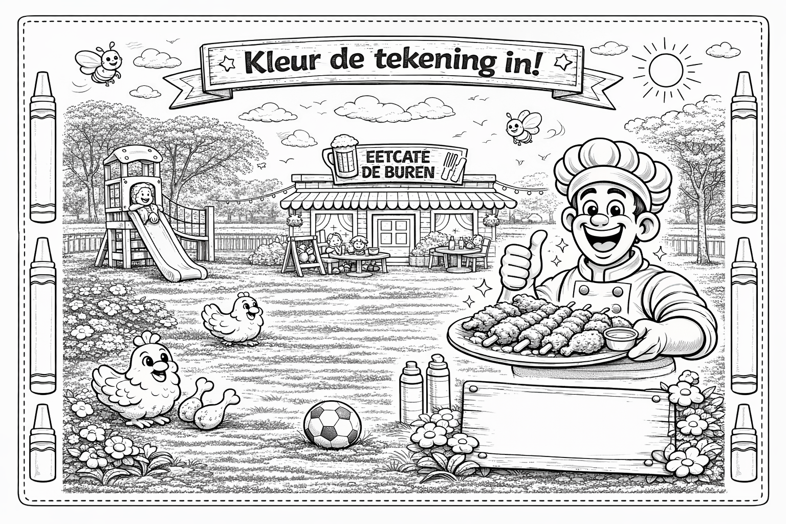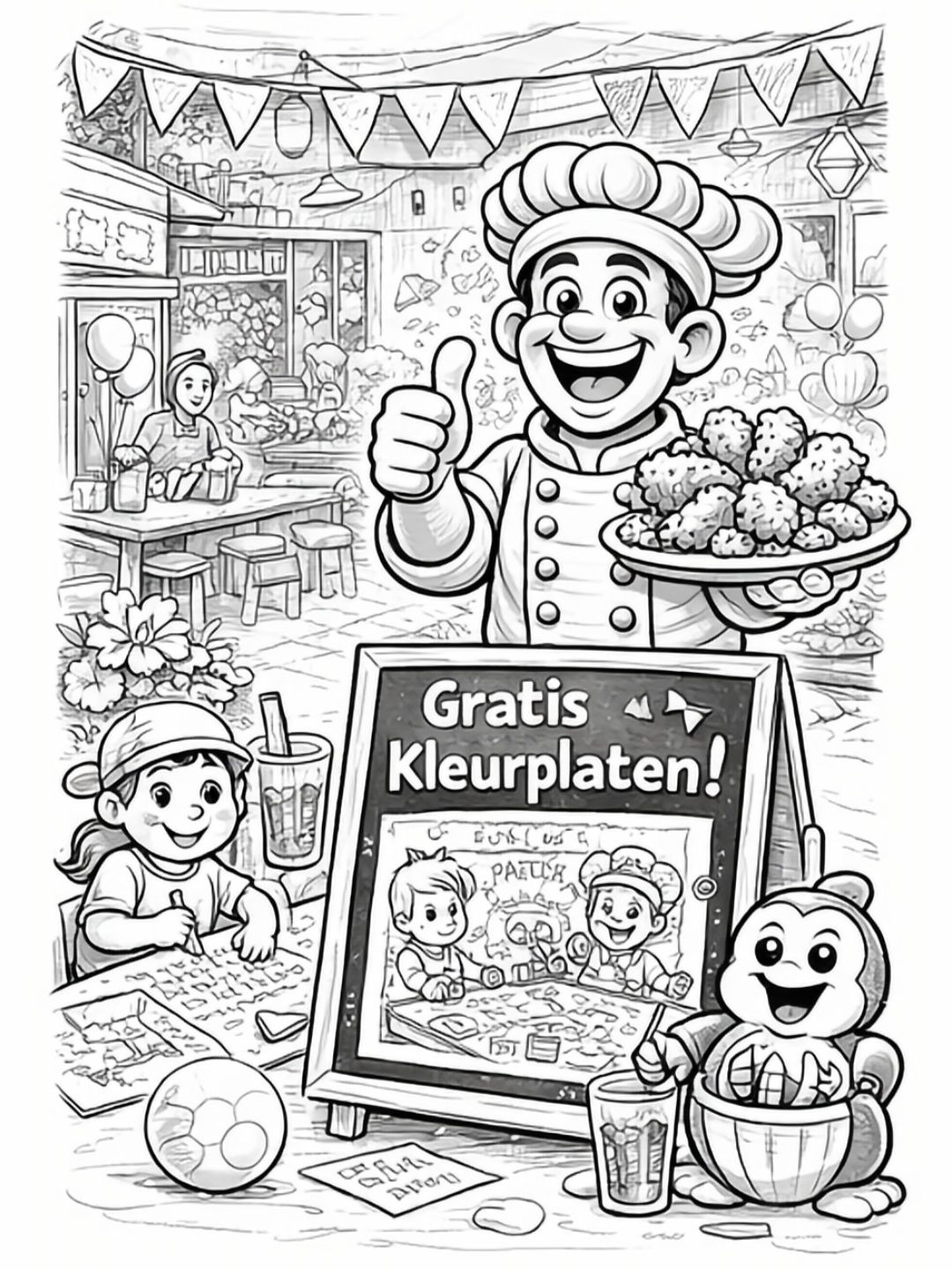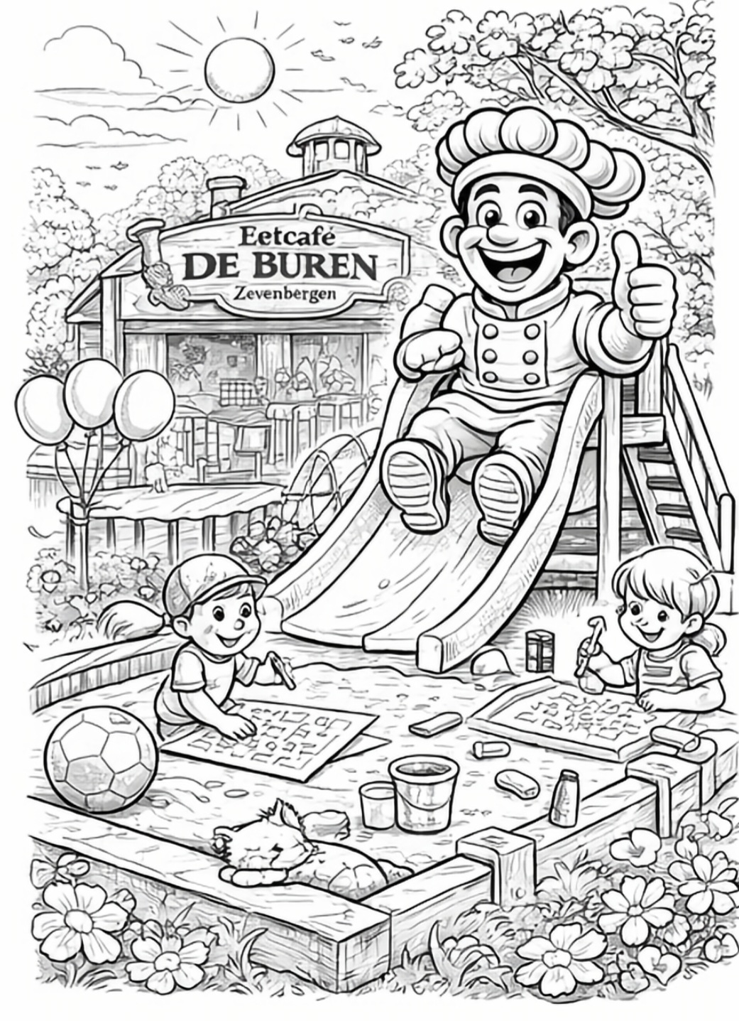 Bij Eetcafé De Buren in Zevenbergen maken we het jou gemakkelijk om onze kleurplaten op te slaan. Wil je de afbeeldingen printen of digitaal bewaren? Dat kan eenvoudig door met de rechtermuisknop op de afbeelding te klikken. Kies daarna voor 'Afbeelding opslaan als...' op je desktop. Voor mobiele apparaten houd je de afbeelding ingedrukt en kies je de downloadoptie. Vergeet niet om je bestanden op te slaan in JPG of PNG formaat voor het beste resultaat. Veel kleurplezier! klik links op de afbeelding om hem te vergroten.