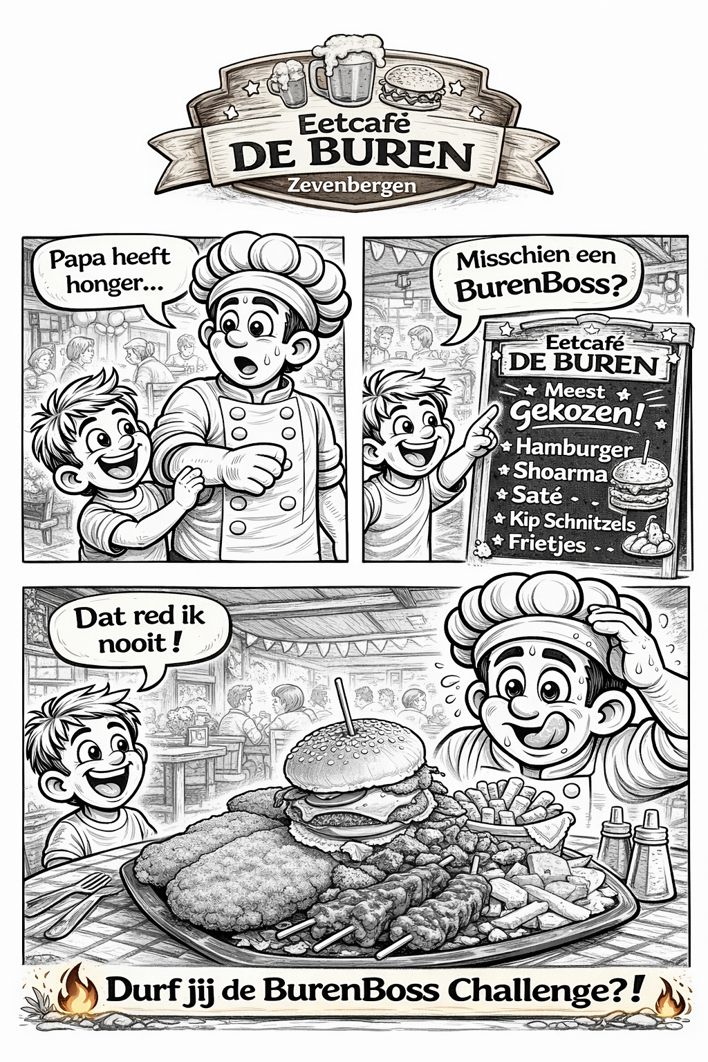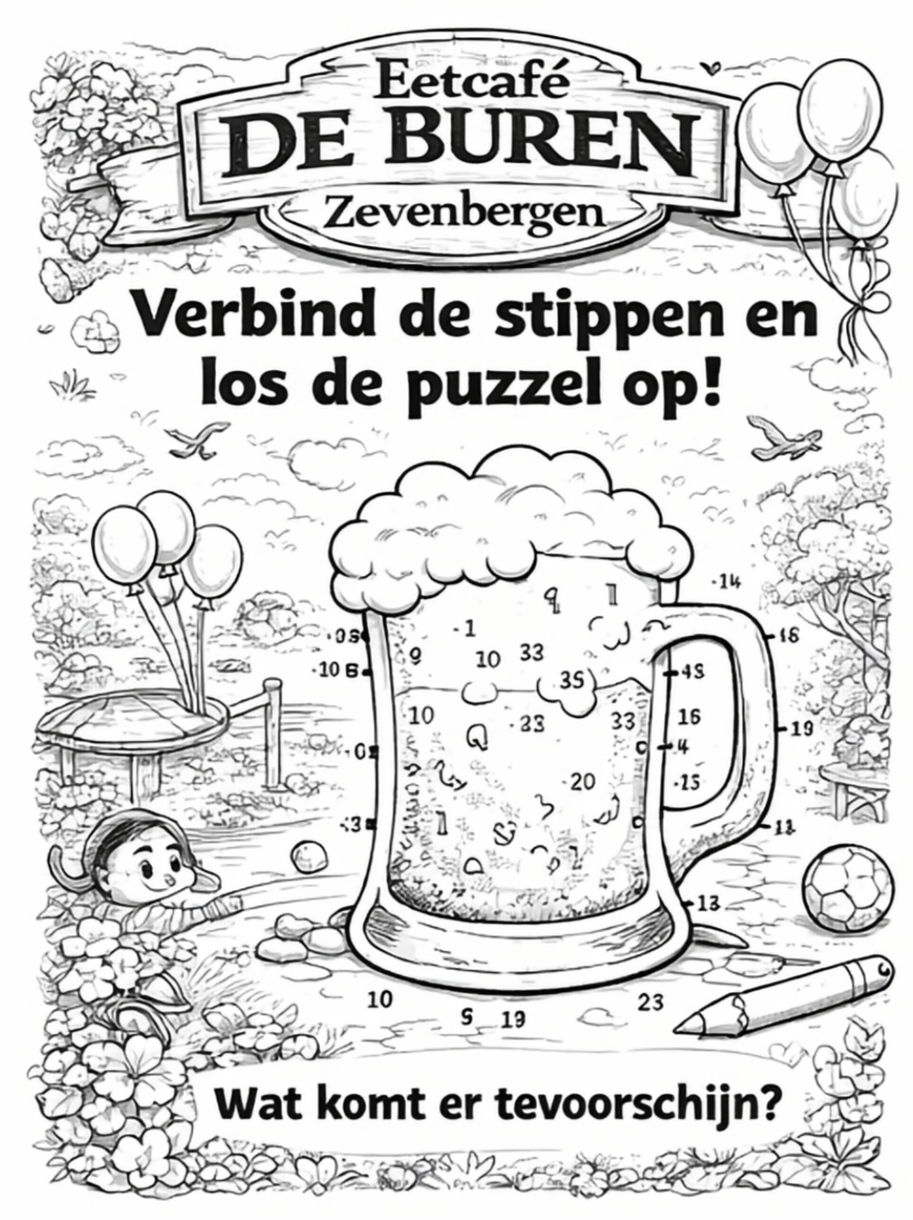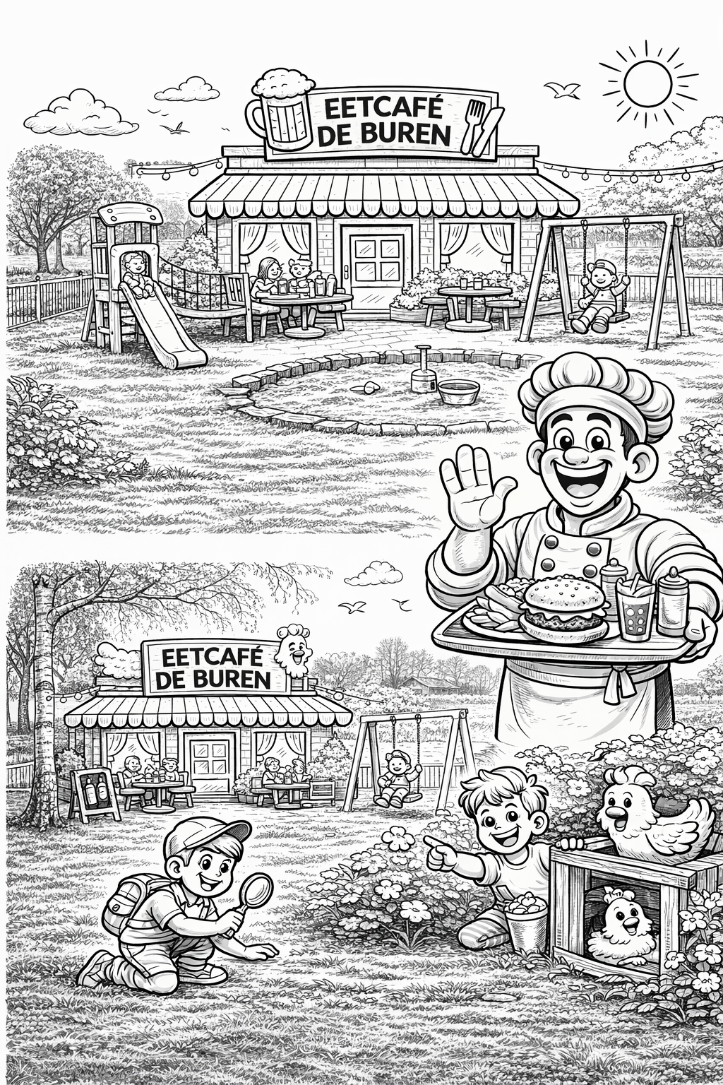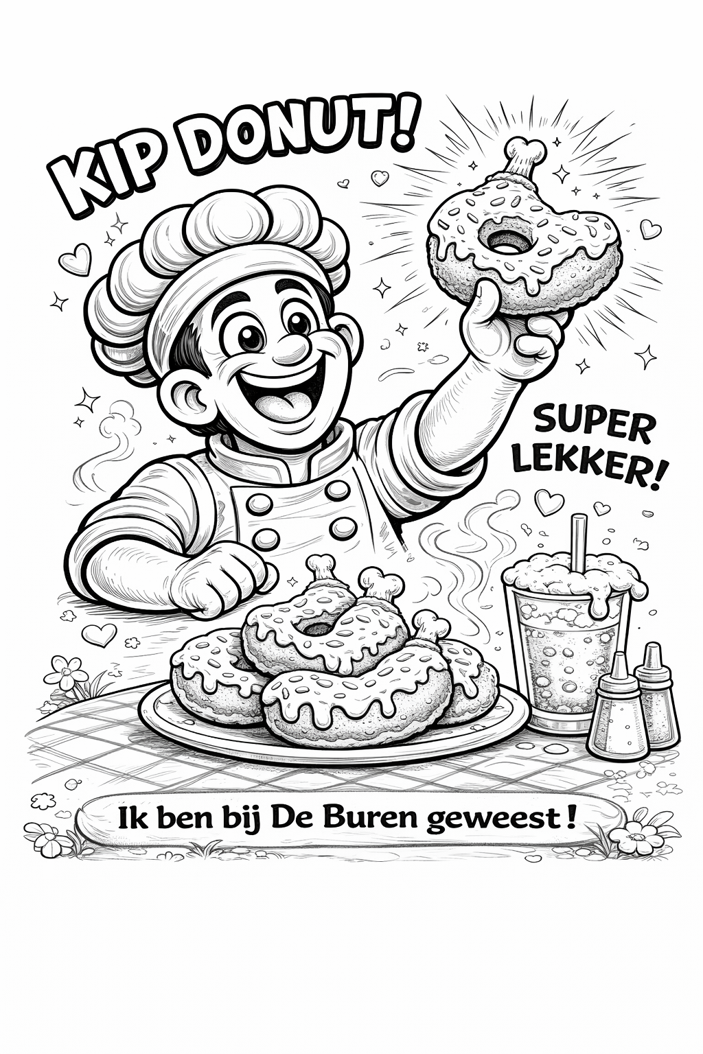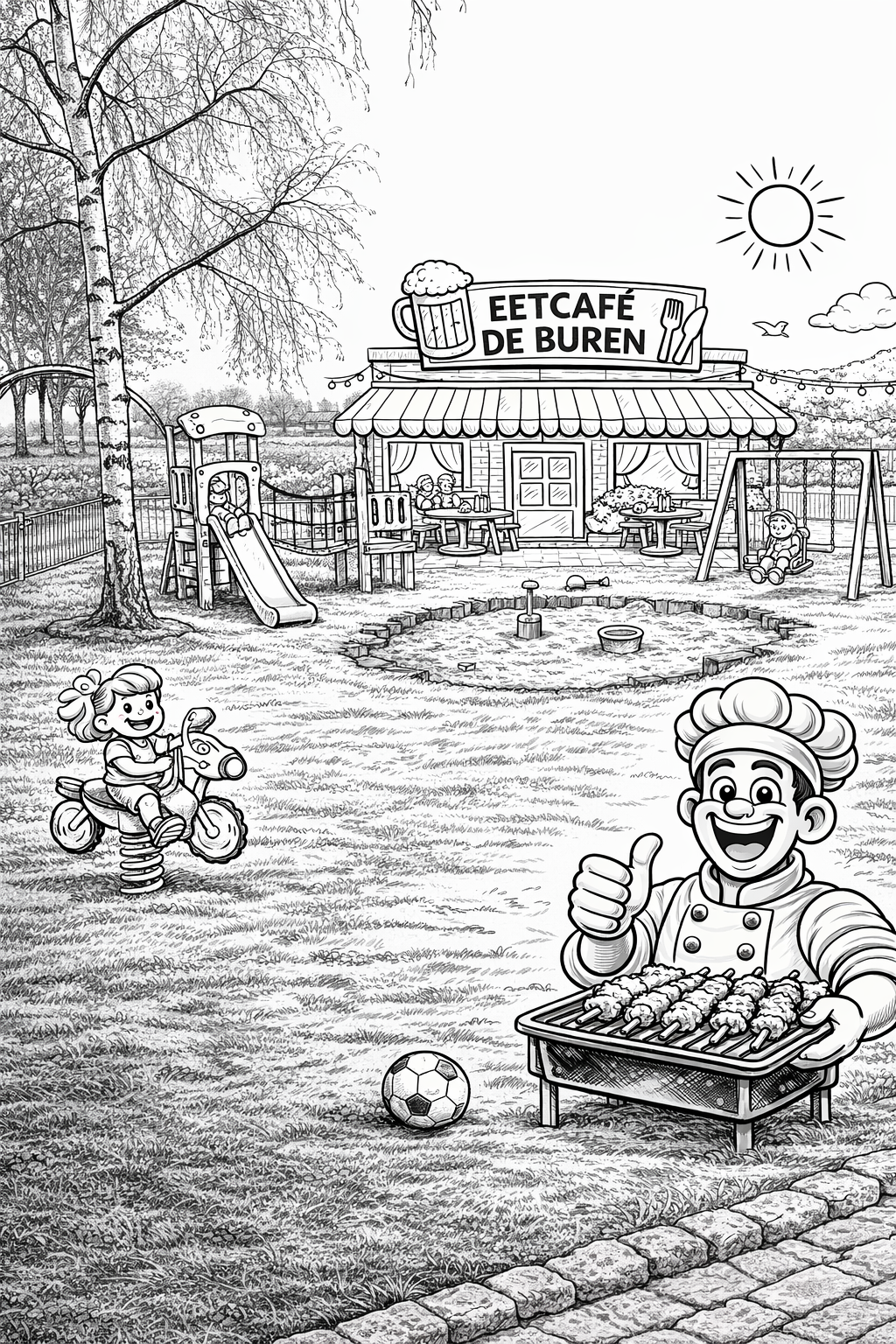 Bij Eetcafé De Buren in Zevenbergen maken we het jou gemakkelijk om onze kleurplaten op te slaan. Wil je de afbeeldingen printen of digitaal bewaren? Dat kan eenvoudig door met de rechtermuisknop op de afbeelding te klikken. Kies daarna voor 'Afbeelding opslaan als...' op je desktop. Voor mobiele apparaten houd je de afbeelding ingedrukt en kies je de downloadoptie. Vergeet niet om je bestanden op te slaan in JPG of PNG formaat voor het beste resultaat. Veel kleurplezier! klik links op de afbeelding om hem te vergroten.